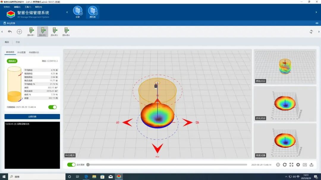 3D可视化更直观:通过点云扫描与数据优化处理,实时生成料仓三维立体图像,点击任意点位即可查看 X/Y/Z 轴坐标与料位高度,无需现场勘查就能掌握仓内实况。